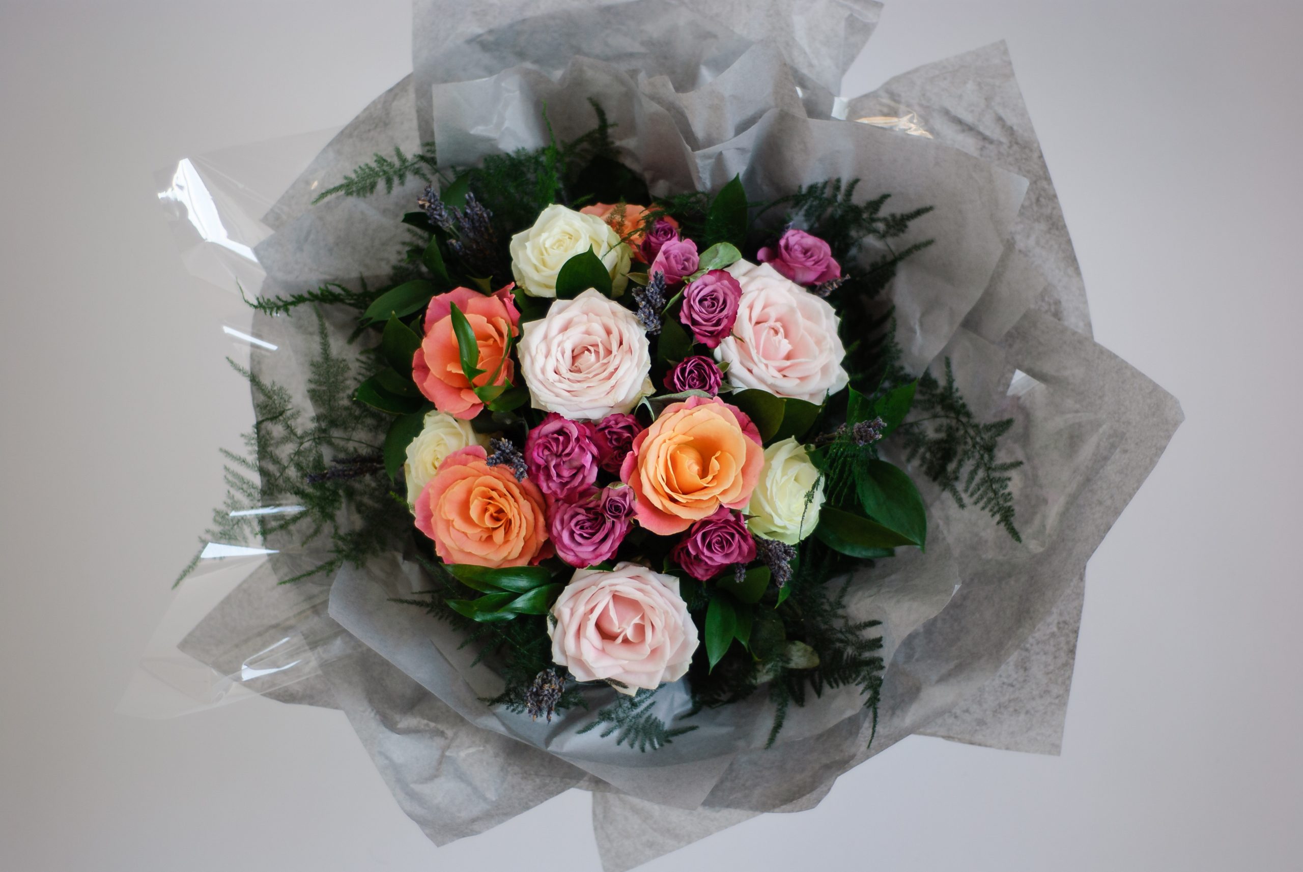 A glamorous mix of scented, long stem, spray and garden roses arranged in a classic dome with lavender and lashings of foliage.